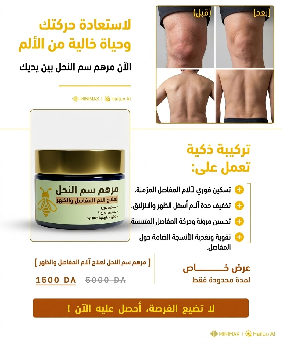 مرهم طبيعي متطور مصنوع من سم النحل الأصيل، مُركّب خصيصاً لعلاج آلام المفاصل والظهر المزمنة. يتغلغل في طبقات العضلات والمفاصل ليريح الألم بسرعة ويقلل الالتهابات من الجذور. بفضل تركيبته الطبيعية 100%، يمنحك راحة حقيقية وملموسة من الاستخدام الأول دون أي آثار جانبية.